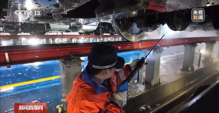 国铁哈尔滨局哈尔滨动车段地勤二检组工长 张朔:通过恒温恒压出水,配合扇形喷头遐想,当年完成一组动车组融冰除雪需耗时六小时,如今仅需三小时。普及死一火的同期保险了动车组安全启动。