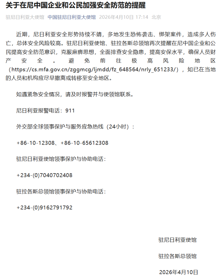 据中国驻尼日利亚大使馆微信公众号音问,4月10日,中国驻尼日利亚使馆发布对于在尼中国企业和公民加强安全着重的领导: