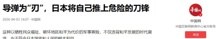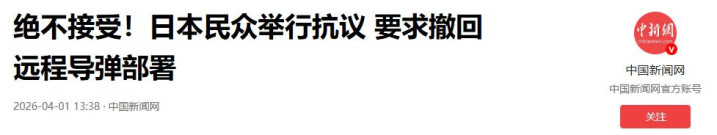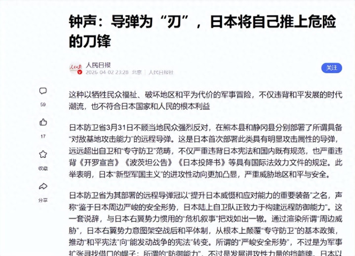 3月31日,日本细心省在熊本县和静冈县同步完成了两款汉典攻击性导弹的实战部署。这是日本自二战陈腐降服以来,初次在原土部署射程特等1000公里的对地攻击刀兵。4月2日,距离导弹部署整整48小时后,《东谈主民日报》在03版“钟声”专栏发表了一篇措辞极为严厉的评述著作,标题掷地赋声——《导弹为“刃”,日本将我方推上危境的刀锋》。