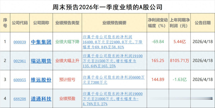 周末,新增4家公司露馅的2026年一季报预报,有东说念主3个月赚了旧年半年的钱,有东说念主得手从死亡泥潭爬出,但也有行业巨头遭受了“倒春寒”,利润径直腰斩。